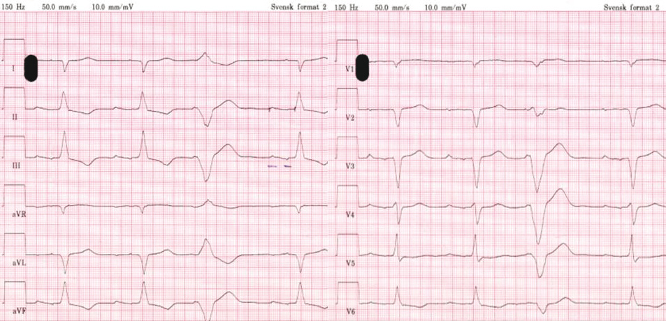 Forskjellige EKG-forandringer vil gjerne forekomme ved hjerteamyloidose. QRS-kompleksene viser ofte tydelig redusert amplitude (low voltage) i ekstremitetsavledningene (6). Kombinasjonen av ventrikulær hypertrofi ved ekkokardiografi og liten QRS-amplitude styrker ytterligere mistanken om denne lidelsen (9). Imidlertid er dette EKG-funnet ikke obligat ved tilstanden, og i en større studie med 127 pasienter med biopsibekreftet hjerteamyloidose ble liten QRS-amplitude bare funnet hos 47 % av pasientene, mens 16 % viste hypertrofikriterier ved vurdering av QRS-kompleksene (10). Spesielt ved de transtyretinrelaterte årsakene kan redusert QRS-amplitude mangle (5). Andre vanlige EKG-funn ved tilstanden er unormal høyre- eller venstredeviasjon av hjerteaksen, pseudoinfarktforandringer, ledningsforstyrrelser og atrieflimmer (2, 6, 10). Ingen EKG-forandringer er imidlertid patognomoniske for tilstanden. Vår pasients EKG viste ikke lav QRS-amplitude, men viste begynnende overledningsforstyrrelse i AV-knuten og pseudoinfarktforandringer i fremre og laterale vegg (fig 1). Det er grunn til å tro at pasientens syke sinusknute og økende blokkering i AV-knuten var relatert til hjerteamyloidosen.