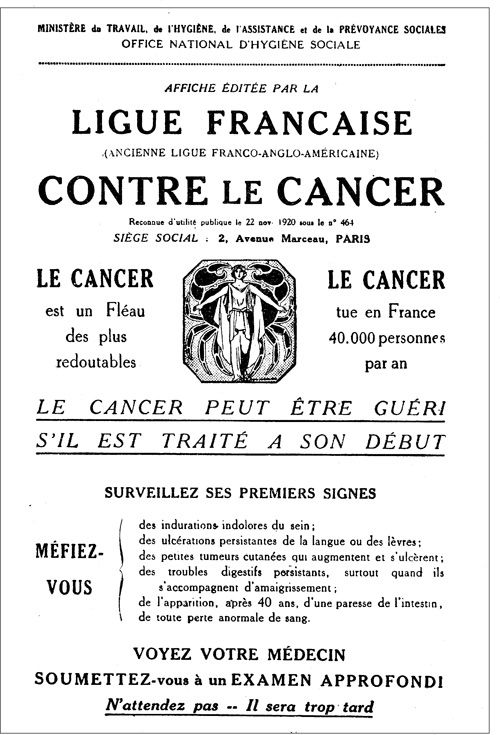 L’association française pour l’étude de cancer ble stiftet i 1908. Foreningen utga et tidsskrift, støttet forskning, drev opplysning og sosialt arbeid. I Tidsskriftet nr. 5/1931 redegjør Bjarne Dahl for den omfattende virksomheten. Kvinnene spilte en viktig rolle. De drev «propagandaen», innhentet statistikk og skaffet penger. Også sykehusplass kunne de ordne, det «arrangerer Mme. Hartmann uten vanskeligheter, da overlægene ved de fleste sykehus er hennes manns tidligere elever» (Tidsskr Nor Lægeforen 1931; 51: 270 – 84).