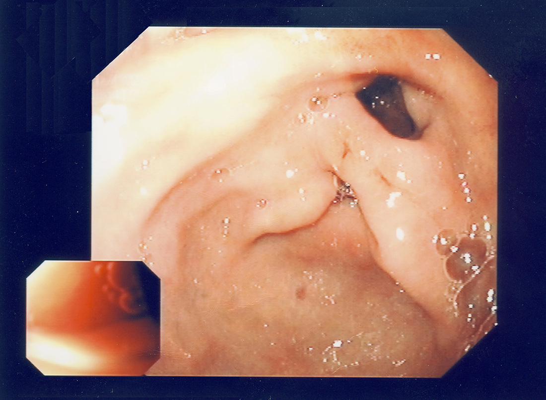 En tidligere frisk mann i 50-årene ble gastroskopert etter å ha vært plaget med epigastriesmerter ett års tid. Det ble påvist en hissig betennelse i den nederste delen av magesekken (antrum) og flere dype sår på pylorus. Helicobacterureasetest var positiv, og pasienten fikk behandling med antibiotika (klaritromycin og metronidazol) og protonpumpehemmer (pantoprazol). Magesmertene forsvant allerede etter to dagers behandling. To måneder senere kom pasienten til kontroll og var da helt symptomfri. Ved ny gastroskopi ble det imidlertid påvist to åpninger mellom ventrikkelen og duodenum (bildet). Begge åpningene ble passert med gastroskopet for å sikre at de ledet til bulbus duodeni. Sårene var ellers normalt tilhelet.