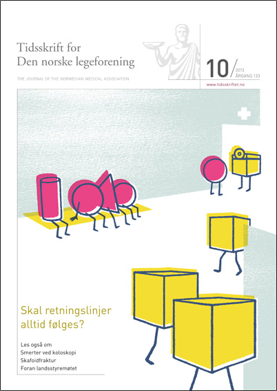 Forsidebildet FORSIDEN () sporsmal_grey_rgb Artikkel Illustrasjon © Superpop Foreløpig er det utgitt et femtitall nasjonale helsefaglige retningslinjer. De blir ofte kritisert for å legge for mye vekt på en gjennomsnittsperson som ikke finnes. Det er ikke sant: Den nasjonale gjennomsnittspersonen er 39 år gammel, 173,5 cm høy og 49,8 % kvinne. Kommentarer ( 0 ) Dette kommentarfeltet modereres, men kommentarer blir ikke redaksjonelt behandlet ut over å sikre at de følger retningslinjer for vårt kommentarfelt. Denne artikkelen ble publisert for mer enn 12 måneder siden, og vi har derfor stengt for nye kommentarer. Publisert: 28. mai 2013 Utgave 10, 28. mai 2013 Tidsskr Nor Legeforen 28. mai 2013 133 : 1039 Publisert: 28. mai 2013 Utgave 10, 28. mai 2013 Tidsskr Nor Legeforen 2013 133 : 1039 PDF Får du ikke vist PDF-filen eller vil lagre filen, kan du høyreklikke på PDF-ikonet. Velg «Lagre mål/fil som..» og hent så opp PDF-filen i for eksempel Acrobat Reader. Skriv ut Anbefalte artikler