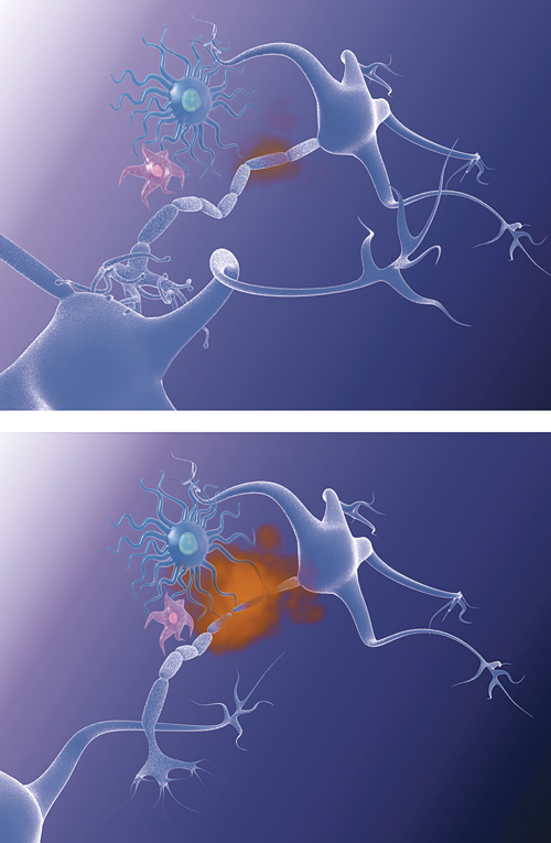 NLRP3-inflammasomet er et proteinkompleks som finnes i bl.a. makrofager og mikroglia. Det reagerer på ulike former for celleskade, bl.a. amyloid-β og presenilin-1, som akkumuleres i hjernen ved Alzheimers sykdom. Disse proteinene finnes også hos eldre transgene APP/PS1-mus, en mye brukt musemodell for Alzheimers sykdom (1) . Stimulert NLRP-3-inflammasom aktiverer caspase-1-enzymet, som danner interleukin 1. Dette cytokinet spiller en viktig rolle i utviklingen av inflammatoriske reaksjoner. I studien ble en rekke tegn på demens, bl.a. redusert stedshukommelse, mindre uttalt hos mus som manglet gener for produksjon av dette inflammasomet eller caspasen. Hos slike mus fant man flere mikroglia av renovatørtype enn av inflammasjonstype. Disse cellene fjernet amyloid-β bedre enn mikroglia hos mus med intakt inflammasjonsreaksjon. Humant hjernevev fra pasienter med Alzheimers sykdom hadde også økt caspase-1-aktivitet.