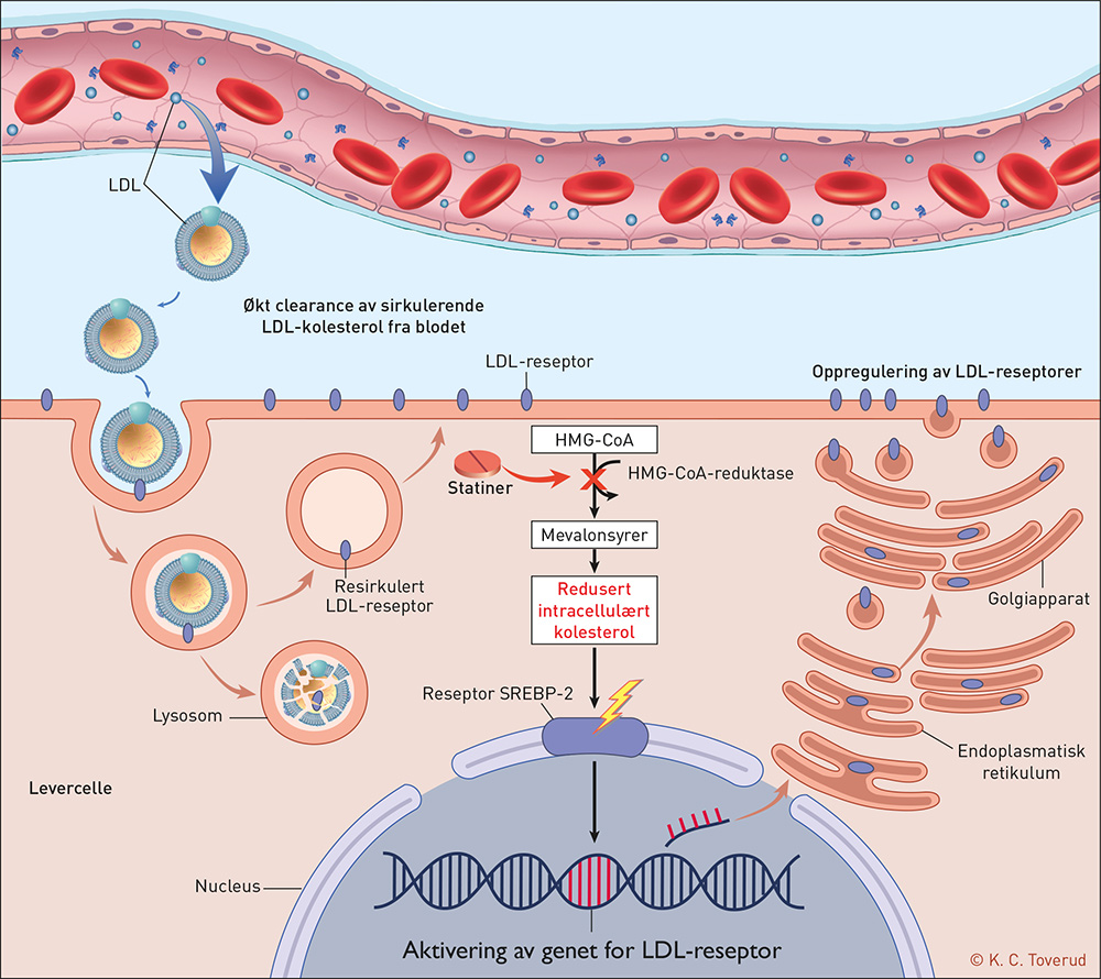 Statiner er en klassebetegnelse på medikamenter som hemmer det hastighetsbegrensende enzymet (HMG-CoA-reduktase) i cellenes kolesterolsyntese (fig 1). Dette fører til oppregulering av low density lipoprotein (LDL)-reseptorer på celleoverflatene og økt clearance av sirkulerende LDL-kolesterol fra blodet. De første statinene ble i 1978 oppdaget som naturlige gjæringsprodukter fra sopp (1) . I dag er seks statiner tilgjengelig på det norske markedet (tab 1). Totalt 488 678 personer fikk i 2011 utlevert minst én resept på statin i Norge (2) .