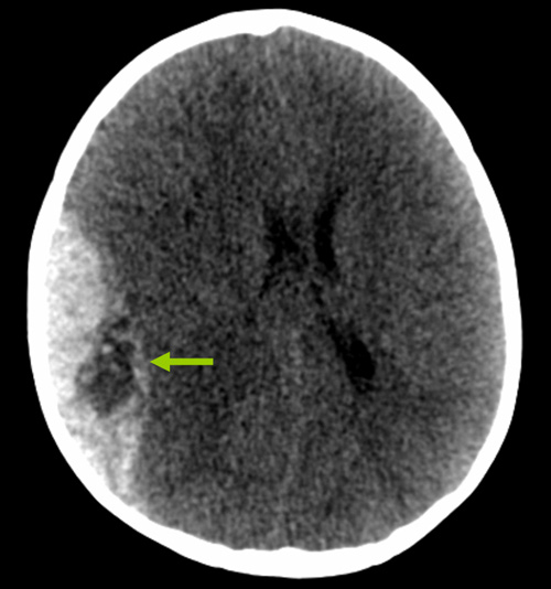 I akuttmottaket åpnet han så vidt øynene på sterke smertestimuli, laget kun enkelte lyder og hadde målrettede avvergebevegelser, dvs. Glasgow Coma Score 9 (pediatrisk GCS-versjon). Etter en rask klinisk undersøkelse ble det utført CT-undersøkelse av hodet. Den viste et stort epiduralt hematom på høyre side, med masseeffekt og midtlinjeoverskyting (bildet til venstre). Man så også det som blir kalt «swirl sign», som indikerer en pågående og kraftig blødning (grønn pil) (2) . På vital indikasjon ble han tatt direkte til Nevrokirurgisk operasjonsstue, der det ble gjort en kraniotomi med evakuering av hematomet. Ny CT-undersøkelse av hodet dagen etter viste pene postoperative forhold (bildet til høyre).