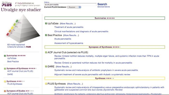 UpToDates sterke anbefaling for sondeernæring med nasojejunal sonde for vår pasient Eva med pankreatitt er basert på en godt utført systematisk Cochrane-oversikt og metaanalyse. At Cochrane-oversikten utgjør det beste kunnskapsgrunnlaget for spørsmålet om ernæring ved akutt pankreatitt, bekreftes ved at den gjenfinnes høyt oppe i kunnskapspyramiden, på nivået under kunnskapsbaserte oppslagsverk og retningslinjer (e-fig 3).