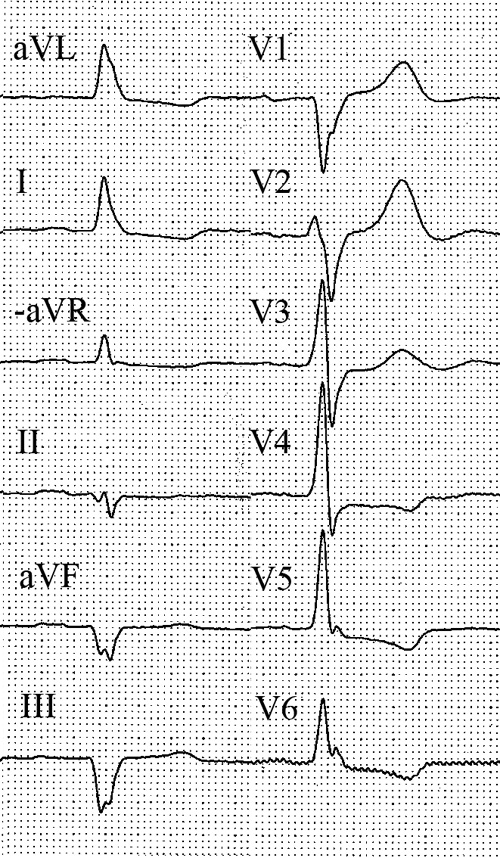 Pasienten møtte ikke til første oppsatte time, han kom til kardiolog først tre måneder etter henvisningstidspunktet. Det ble tatt standard 12-avlednings-EKG, som viste sinusrytme med frekvens 76/min. Patologiske Q-takker i nedre vegg viste gjennomgått infarkt, noe som også forklarte det lett breddeforøkte QRS med venstre aksedeviasjon. Det var i tillegg ST-avvik fra grunnlinjen og T-bølgeinversjon som passet med gammelt infarkt (fig 1).