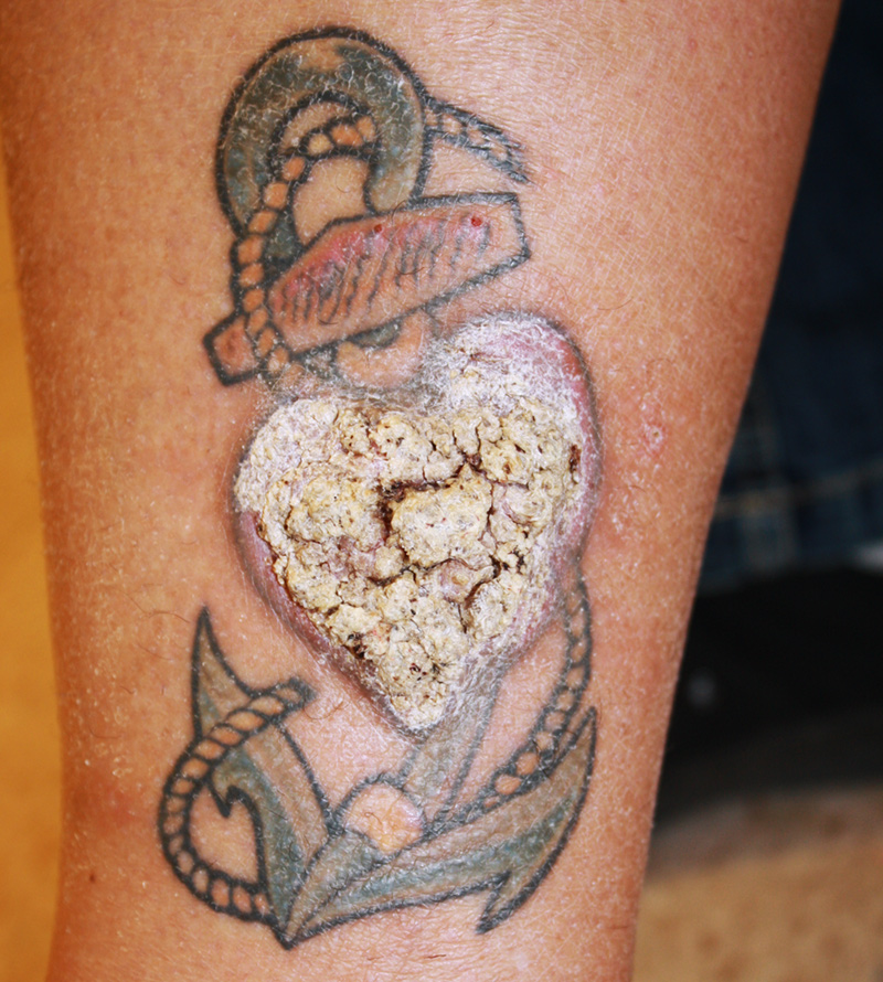 En tidligere frisk kvinne med kjent kontaktallergi mot sink ble tatovert av en profesjonell tatovør. I løpet av to uker utviklet hun kløe og hevelse i det tatoverte området. Det oppsto en hyperkeratotisk hudtumor i den delen av tatoveringen som var utført med rødt blekk (fig 1). Hun oppsøkte lege, som tok en biopsi. Histologisk undersøkelse var forenlig med keratoakantom, en benign tumor som etter vår erfaring kan være vanskelig å skille fra kutant plateepitelkarsinom både klinisk og histologisk. Det tatoverte området, inkludert hudtumor, ble eksidert (fig 2) og dekket med en delhudstransplantasjon. Ved histologisk undersøkelse av resektatet ble diagnosen endret til pseudoepiteliomatøs hyperplasi.
