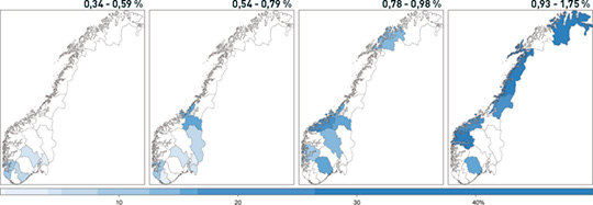 Risiko for ikke-planlagt fødsel utenfor institusjon og reiseavstand til fødeinstitusjoner. Fylkene er gruppert i fire ulike risikokategorier basert på perioden 2004 – 09. Fargeskalaen viser andel kvinner som bodde utenfor entimessonen i hvert fylke (%) per 1.1. 2010 (data fra Medisinsk fødselsregister og Statistisk sentralbyrå, kombinert med data fra Norsk vegdatabank) (1 )