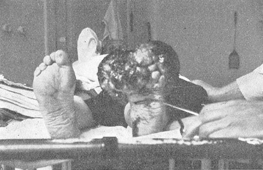 Ved innkomsten var hennes almentilstand dårlig, preget av senilitet og intoksikasjon. På v. fotrygg såes en voluminøs tumor som strakte sig nedover hele fotryggen fra vristen og forbi tærne og nådde på begge sider langt utenfor den mediale og laterale fotkant ; den målte 18 × 15 × 9 cm. Overflaten var ujevn blomkålaktig med dype nedsøkk og furer og belagt med blodige, slimete avsondringer. Den utviklet en stank så intens at det var med stor overvinnelse man nærmet sig den for å ta den i nærmere øiesyn. I v. lyskeregion fantes et infiltrert glandelpakett.