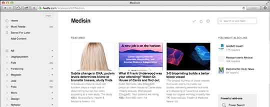 Det finnes mange RSS-lesere, men av de mest oversiktlige er Feedly, som både har en god internettleser og applikasjoner for smarttelefoner. Som mange andre ligger programmet i den digitale skyen, så strømmene dine vil bli synkronisert på tvers av både telefoner, nettbrett og datamaskinger uten at du trenger å tenke på det.