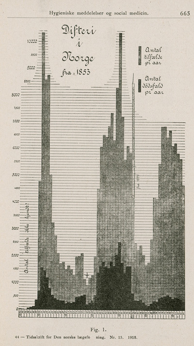 Difterien viser i sit epidemiologiske forløp en eiendommelig tilsynelatende sprangvis optræden, saavel med hensyn til morbiditet som mortalitet. I Europa viser den sig antagelig først som nogen erkjendbar større epidemi i 1500 og 1700 for i slutningen av dette aarhundrede helt at forsvinde. I det 19de aarhundrede er vi oppe i flere store epidemier, og det er først fra dette aarhundredes begyndelse, at sygdommens patologiske natur erkjendes og nærmere blir bestemt (Bretonneau). Vi har den første større epidemi i 1820 – 1830-aarene, og saa faar den i 1840-aarene igjen en større utbredelse; i Norge viser denne sig at herje en 6 aars tid fra ca. 1840 til 1856 (Kielland). Den største pandemi optrær i slutningen av 1850-aarene og varer her i Norge fra 1859 til 1867 med klimaks i 1861, hvor antal angrepne naar over 10 000; i 1878 har epidemien naadd det minste antal angrepne – litt over 800 (fig. 1). Den tredje større epidemi i Norge tar sin begyndelse i 1882 og naar sin største utbredelse i 1890, hvor vi igjen er oppe i over 10 000 tilfælder; dennes herjing varer ca. 13 aar indtil 1895 for saa at naa sit laveste tal i 1900, da ca. 1700 er angrepet. – Vi er allerede et par aar efter (1902) paa den fjerde bølges steilt opadstigende kurvelinje, som naar sin top i 1906 og 1907 med vel 6800 tilfælder; nu falder vistnok kurven, men yderst langsomt; i 1914 er saaledes antalet vel 4400; fra kurven for Kristiania at dømme skulde vi allerede i 1916 muligens staa likeoverfor en ny stigning.