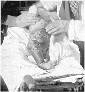 Eksantemet: På de store gangrenøse effloresenser er nu krustene falt av, og de 1 – 5 øre store sår ligger i dagen (se fotografiet). Sårbunnen har renset sig på flere av dem helt ned til fascien. Sårrandene er steile, svulne og hyperemiske. Ved å klemme barnets toraks og abdomen sammen fra side til annen kan store mengder puss (sølvmateriale?) trykkes ut av hullene på for- og baksiden.