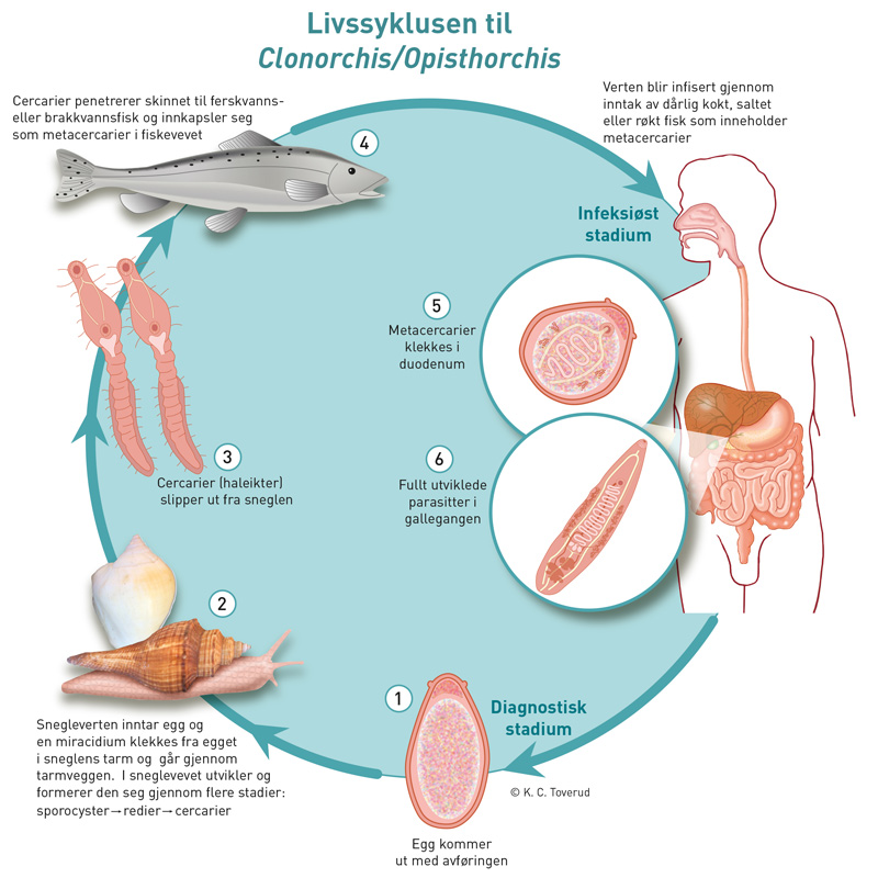 Parasittens livssyklus starter med at ikten legger egg i gallegangene til verten. Egg kommer med avføringen ut i overflatevann og spises av ferskvannssnegler (1. mellomvert). I sneglen gjennomgår parasitten aseksuell utvikling i flere stadier til cercariae som frisettes ut i vannet igjen. Cercariae penetrerer aktivt inn i muskulaturen til fisk (2. mellomvert) og omvandles til et cystestadium. Mennesker infiseres ved inntak av utilstrekkelig behandlet fisk (for lite kokt, saltet, syltet eller røkt). Cystene omdannes i duodenum til metacercariae som migrerer opp i gallegangene til vertene, der de utvikler seg til modne parasitter. En parasitt kan leve i gallegangene til en person i 20 – 30 år, muligens lenger (fig 1) (7), og kan produsere opptil 1 000 – 2 500 egg per dag.