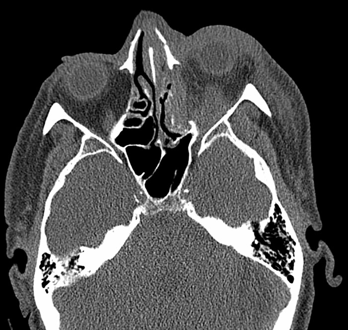 En mann i 60-årene ble innlagt etter en fallskade med traume mot ansiktsregionen. CT av ansikt viste nesefraktur, venstresidig fraktur av orbitagulvet og mediale orbitavegg med dislokasjon samt intraorbitalt hematom. Bulbus var intakt (bildet til venstre). Klinisk undersøkelse viste venstresidig periorbitalt hematom og uttalt proptose. Ved palpasjon var venstre øye spent uten elastisitet. Det forelå svært innskrenket øyebevegelighet av venstre øye i samtlige blikkretninger, nærmest oftalmoplegi. Det var verken direkte eller indirekte lysreaksjon og fullstendig tap av synet på venstre øye. Intraokulært trykk på venstre øye var målt til 70 mm Hg.
