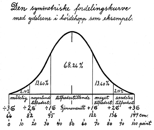 Hvis man avsætter standardavvikelsen (σ) 3 ganger paa hver side av gjennemsnittet, omfatter dette omraade de aller fleste præstationer. Man kan derfor kalde dette for det normale variationsomraade. Dette blir ved standardavvikelsen delt i 6 grupper. Se fig.¹) Man kunde si, at de to grupper, som ligger nærmest over og under gjennemsnittet, har tilfredsstillende præstationer; betegnet med «meget tilfredsstillende» og «nogenlunde tilfredsstillende». Præstationerne i de to ytterste grupper kunde man betegne med «særdeles tilfredsstillende» og «maatelig». Ved en helt symmetrisk og regelmæssig fordeling vil nu 68,26 pct. (d. e. ca. 2/3) av alle ligge i den midterste gruppe, 13,60 pct. i hver av de følgende grupper og 2,14 pct. i de to ytterste grupper. Grændsen for disse grupper er opført i tabel 3. (For hævning i armerne og 60 m. løp, hvor fordelingen er skjæv, er gruppegrænserne beregnet ved hjelp av disse procenttal).