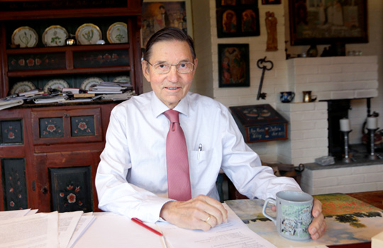 Han hentar fram eit gamalt fotografi frå doktormiddagen sin heime i Øvrelia i Bergen. Rundt bordet sit menn i kjole og kvitt, damer med fjonge 60-talskjolar og frisert hår. Ivrig konverserande, ser det ut til.