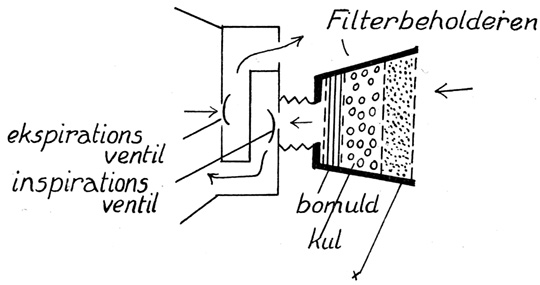 Opfinderen Fernez har konstruert en helt effektiv maske efter filtrationsmetoden med forskjellig aapning for inspirations- og ekspirationsluft ; filtret er beskyttet av en metallkapsel. Flg. tegning viser principet.