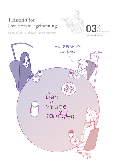 Forsidebildet FORSIDEN () sporsmal_grey_rgb Artikkel Illustrasjon © Helena Ohlsson Døden er det eneste sikre ved livet. Derfor er det paradoksalt hvor lite forberedt vi ofte er når den kommer. Vi bør ta samtalen om de viktige valgene på forhånd. Etterpå er det for sent. Kommentarer ( 0 ) Dette kommentarfeltet modereres, men kommentarer blir ikke redaksjonelt behandlet ut over å sikre at de følger retningslinjer for vårt kommentarfelt. Denne artikkelen ble publisert for mer enn 12 måneder siden, og vi har derfor stengt for nye kommentarer. Publisert: 10. februar 2015 Utgave 3, 10. februar 2015 Tidsskr Nor Legeforen 10. februar 2015 135 : 207 Publisert: 10. februar 2015 Utgave 3, 10. februar 2015 Tidsskr Nor Legeforen 2015 135 : 207 PDF Får du ikke vist PDF-filen eller vil lagre filen, kan du høyreklikke på PDF-ikonet. Velg «Lagre mål/fil som..» og hent så opp PDF-filen i for eksempel Acrobat Reader. Skriv ut Anbefalte artikler
