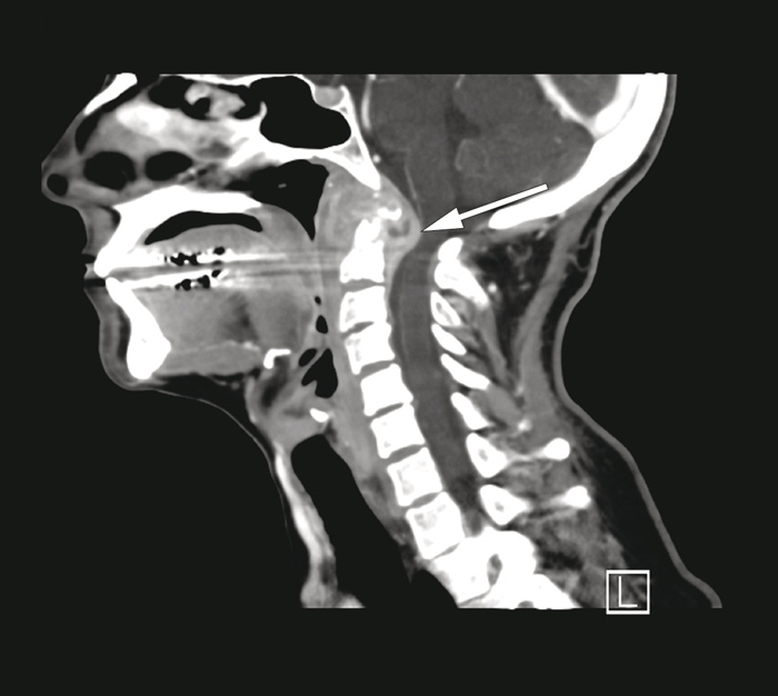 Hun ble innlagt for medisinsk utredning på grunn av langvarig og uavklart, antatt alvorlig tilstand. Ved innleggelsen hadde hun svelgevansker og redusert matlyst. Hun var i god allmenntilstand og afebril. Man fant ved øre-nese-hals-undersøkelse en neseseptumperforasjon, men ellers normale funn. C-reaktivt protein (CRP) var 85 mg/l (< 5 mg/l). Blodkulturer viste ingen oppvekst. Som ledd i utredningen, og på grunn av hennes nevrologiske symptomer, ble det dagen etter innleggelsen rekvirert CT av collum og thorax samt MR av collum. Disse undersøkelsene viste destruksjon av atlasbuene og dens axis, med betydelig omkringliggende bløtdelshevelse og innsnevring av spinalkanalen med kompresjon av medulla (fig 1).