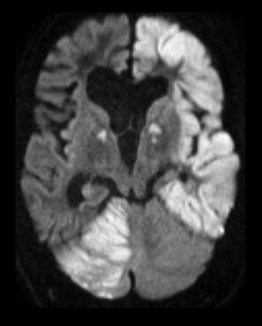 MR-forandringene på bildet illustrerer nevroanatomien med det fokale utgangspunktet i venstre storhjernehemisfære. Signalene forplanter seg til thalamus og basalganglier bilateralt og til kontralaterale lillehjernehemisfære via kryssede og ukryssede aksonale baner.
