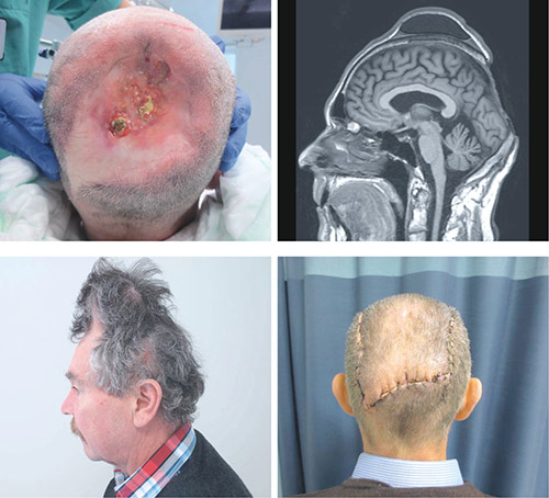 I forbindelse med langvarig antibiotikabehandling etter en hoftefraktur med påfølgende infeksjon utviklet han spontant en ulcerasjon i den tynne huden parietooksipitalt (bildet øverst til venstre), og han fikk samtidig hodepine. Sårdanning og hodepine forverret seg gradvis over noen måneder, og han ble innlagt på nevrologisk avdeling. Under den aktuelle innleggelsen ble han blant annet utredet med cerebral MR som viste en beindefekt i kraniet på 6 × 7 cm, mens det underliggende hjerneparenkymet var upåfallende. Imidlertid var det kun et marginalt sjikt mellom ulcerasjonen og hjernen. På grunn av økende utbredelse og væsking fra det kroniske såret ble det funnet indikasjon for kirurgisk behandling. Biopsier fra ulcerasjonene hadde ikke vist tegn til malignitet som kan oppstå etter kroniske sår og brannskader (1) . Man besluttet å legge inn en vevsekspander mellom galea og periosteum, som over de neste månedene ble ekspandert med ca. 500 ml saltvann (bildene øverst til høyre og nederst til venstre). I denne perioden gikk ulcerasjonen – og da også hodepinen – spontant tilbake. Ved avsluttet ekspansjon etter fem måneder hadde man tilstrekkelig vev til å kunne transponere frem en hårbærende fullhudslapp (bildet nederst til høyre). Man deepitelialiserte det gamle arret uten perforasjon av dura. Kraniedefekten består, og pasienten er anbefalt å bruke sin gamle tilvirkede eksterne beskytter i risikosituasjoner.