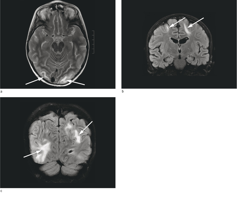 Det klassiske bildet er symmetrisk ødem i hvit substans baktil i hjernehemisfærene, med parietal- eller oksipitallappene affisert i 98 % av tilfellene (9). Samtidig er det vanlig med affeksjon av andre deler av hjernen: frontallappene er rapportert å være affisert i 68 % av tilfellene, temporallappene i 40 % og cerebellærhemisfærene i 30 %, og mer enn en firedel av lesjonene er asymmetriske (9). Ettersom de tidlige forandringene kan være subtile, bør man beskrive den kliniske mistanken på rekvisjonen, slik at radiologen kan se spesielt etter disse forandringene.