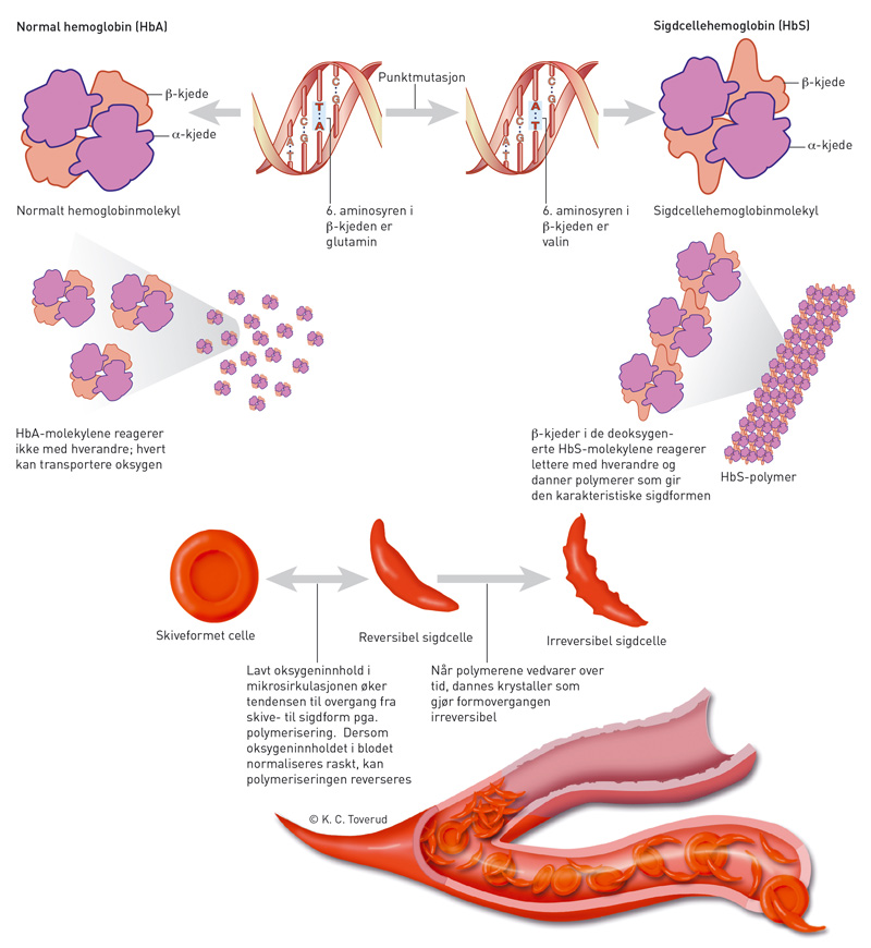 Sigdcelleanemi er en av verdens mest utbredte arvelige sykdommer. Verdens helseorganisasjon beregner at det hvert år fødes over 200 000 barn i verden som er homozygote, mens ca. 5 % av verdens befolkning er heterozygote bærere. Over 90 % lever i Afrika, India og på den arabiske halvøy, men pga. migrasjon ses sigdcelleanemi stadig oftere i Nord-Amerika og Europa (6, 7). Hos voksne består normalt hemoglobinmolekylet HbA (adult) av fire globinkjeder, to alfa- og to betakjeder (fig 2). Ved sigdcelleanemi finnes sigdcellehemoglobin, HbS, der en punktmutasjon i DNA gjør at den 6. aminosyren i betakjeden, glutamin, er erstattet med valin. Dette gir HbS endrede egenskaper med økt tendens til polymerisering av hemoglobinmolekylene ved redusert oksygenmengde i blodet. HbS beskytter mot malaria, noe som antas å forklare hvorfor mutasjonen er spesielt vanlig i vestafrikanske områder der malaria er vanlig (2).