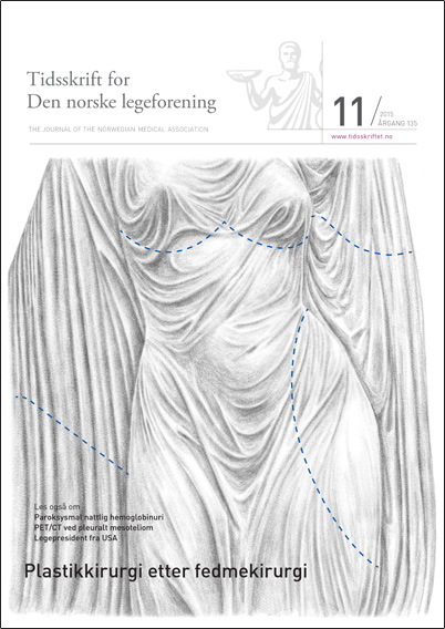 Forsidebildet FORSIDEN () sporsmal_grey_rgb Artikkel Illustrasjon © Jonna Fransson/Agent Molly & Co Ekstrem fedme kan være kroppsdeformerende. Etter fedmekirurgi kan store deler av kroppsvekten forsvinne. Da må kroppen formes på ny. Kommentarer ( 0 ) Dette kommentarfeltet modereres, men kommentarer blir ikke redaksjonelt behandlet ut over å sikre at de følger retningslinjer for vårt kommentarfelt. Denne artikkelen ble publisert for mer enn 12 måneder siden, og vi har derfor stengt for nye kommentarer. Publisert: 16. juni 2015 Utgave 11, 16. juni 2015 Tidsskr Nor Legeforen 16. juni 2015 135 : 1003 Publisert: 16. juni 2015 Utgave 11, 16. juni 2015 Tidsskr Nor Legeforen 2015 135 : 1003 PDF Får du ikke vist PDF-filen eller vil lagre filen, kan du høyreklikke på PDF-ikonet. Velg «Lagre mål/fil som..» og hent så opp PDF-filen i for eksempel Acrobat Reader. Skriv ut Anbefalte artikler