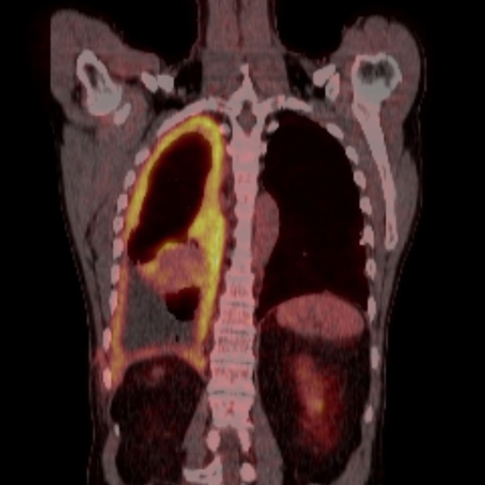 En mann i 60-årene ble utredet på bakgrunn av økende dyspné. Han hadde vært eksponert for asbest noen uker i 1970-årene, og hadde røykt fra 15 års alder. Det ble ikke funnet atypiske celler i pleuravæske. Diagnosen pleuralt mesoteliom ble fastsatt etter åpen pleurabiopsi. 18-fluorodeoksyglukose positronemisjonstomografi kombinert med computertomografi (18F-FDG PET/CT) ble rekvirert for å avklare om han kunne være kandidat for kirurgi.