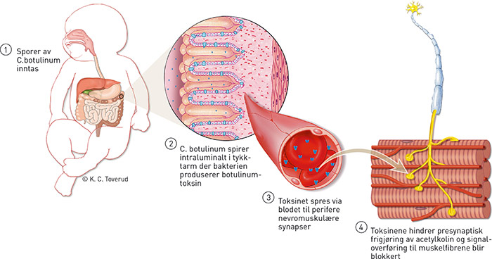 Spedbarnsbotulisme er en sjelden tilstand i Norge, med fem publiserte tilfeller siden første beskrivelse i 1997 (11, 12). Sporer i honning er en kjent smittekilde, og honning skal ikke gis til barn under 12 måneder (13). Tilstanden forekommer hos barn i alderen 1 uke – 1 år (median 3 – 4 måneder). Manglende konkurrerende tarmflora er én av faktorene som bidrar til sårbarhet hos spedbarn (14). Tilstanden oppstår når sporer av C. botulinum (sjeldnere C. baratii eller C.butyricum) inntas og spirer intraluminalt i tykktarm, der bakterien produserer botulinumtoksin. Toksinet spres via blodet til perifere nevromuskulære synapser, der det hindrer frigjøring av acetylkolin og dermed hemmer presynaptisk nevromuskulær signaloverføring (fig 1).