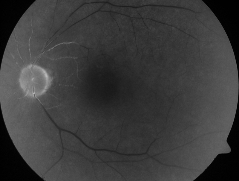 På mistanke om kjempecellearteritt ble behandling igangsatt med metylprednisolon intravenøst 250 mg × 4 i fire dager, deretter 60 mg prednisolon daglig og videre langsom nedtrapping. Tross behandling opplevde pasienten initialt stadige ortostatisk utløste kortvarige synstap. Etter to døgn ble acetylsalisylsyre lagt til behandlingen. Det tredje døgnet mistet pasienten synet på venstre øye. Fluoresceinangiografi tatt under synstapet viste tilnærmet opphevet retinal sirkulasjon. Bildet til venstre viser en nær komplett avstenging av arteria centralis retinae – lyse, fluorescerende kar er perfunderte, mens mørke ikke er perfunderte. Etter omtrent seks timer kom synet tilbake.
