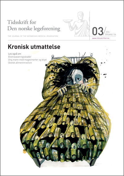 Forsidebildet FORSIDEN () sporsmal_grey_rgb Artikkel Illustrasjon © Hilde Thomsen Kronisk utmattelsessyndrom har vært et stridens eple i medisinen. Bak diskusjonene om årsaker, diagnosekriterier og behandlingsmetoder ligger det lidende pasienter – i påvente av mer kunnskap. Kommentarer ( 0 ) Dette kommentarfeltet modereres, men kommentarer blir ikke redaksjonelt behandlet ut over å sikre at de følger retningslinjer for vårt kommentarfelt. Denne artikkelen ble publisert for mer enn 12 måneder siden, og vi har derfor stengt for nye kommentarer. Publisert: 9. februar 2016 Utgave 3, 9. februar 2016 Tidsskr Nor Legeforen 9. februar 2016 136 : 199 Publisert: 9. februar 2016 Utgave 3, 9. februar 2016 Tidsskr Nor Legeforen 2016 136 : 199 PDF Får du ikke vist PDF-filen eller vil lagre filen, kan du høyreklikke på PDF-ikonet. Velg «Lagre mål/fil som..» og hent så opp PDF-filen i for eksempel Acrobat Reader. Skriv ut Anbefalte artikler