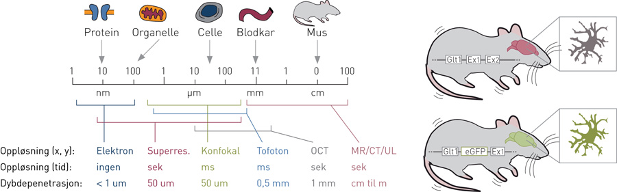 De fleste relevante lysfølsomme eller fluorescerende proteinene krever lys med nokså høy energi for å bli stimulert (blått-grønt). Det medfører varmeskade i vevet og begrenser hvor dypt vi kan «se» (< 50 μm eller ett par cellelag).