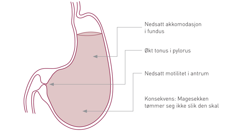 De vanligste symptomene ved gastroparese er kvalme og oppkast, mens magesmerter, tidlig metthetsfølelse, oppfylthet etter måltider og oppblåst mage også forekommer hyppig (3, 4). Halvparten av pasientene går ned i vekt (4). For å stille diagnosen krever gjeldende retningslinjer verifikasjon av forsinket ventrikkeltømming uten et påvisbart mekanisk passasjehinder (1, 2). Imidlertid er sammenhengen mellom ventrikkeltømmingshastigheten og den individuelle symptombyrden ofte svak (5). Det kan derfor komme endringer i retningslinjene, der man i stedet definerer gastroparese som en mer generell nevromuskulær dysfunksjon i magesekken (6).