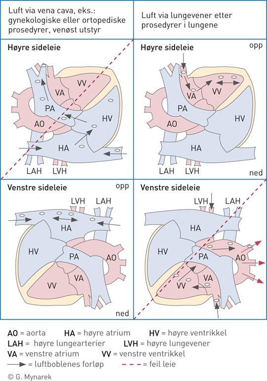 Ved plutselig peroperativt fall i endetidal CO₂, plutselig nedsatt bevissthetsnivå, peroperativ hjertestans eller fokalnevrologiske utfall må muligheten for gassemboli vurderes (3). Ved slik mistanke skal trykkammerbehandling prioriteres foran alt annet. Det skal ikke legges sentralt venekateter i et forsøk på å suge ut luft. Det skal heller ikke gjøres CT for å verifisere diagnosen – all tid teller!