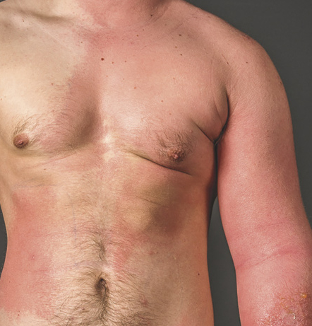 En gutt i tenårene utviklet smerter, erytem, blemmer og hevelse på venstre side av kroppen fem dager etter en brytekamp. Han ble innlagt i sitt lokalsykehus hvor han ved innkomst var i god allmenntilstand, afebril, med et normalt antall hvite blodceller og negativt CRP-nivå. SSSS (staphylococcal scalded skin syndrome) ble mistenkt, og han fikk intravenøs antibiotika. Samtidig ble han henvist til dermatologisk avdeling.