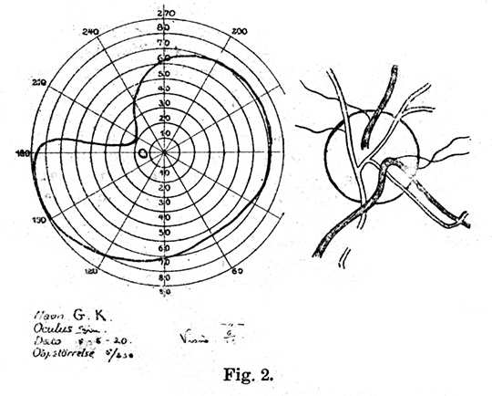 Ved øienundersøkelsen 24 timer senere var der intet at bemerke ved høire øie. I venstre fundus saaes en papilleradius fra papillekanten et stykke av arteria inf. med. skinnende hvit, i en vel papilleradius’ utstrækning (se fig. 2), blodsøilen centralt og perifert for det hvite parti var helt ubrutt, og karret saa her ganske ut som de øvrige arterier i øienbunden, dog var farven maaske litt mørkere. Øienbunden forøvrig var normal, ingen hæmorragier, intet ødem. Visus var med korrigerende glas 6/12, som paa det andet øie. Urinen var fysiologisk, blodtrykket 120 R. R. Dagen efter var billedet litt forandret ; det skinnende hvite parti saa vistnok ganske ut som før, men perifert for dette var arterien blit smalere og mørkere, litt mørkere end en vene, og hist og her saaes hvite refleksprikker langs arterien, som om blodsøilen begyndte at dele sig op. To dager senere, fire dager efter hændelsen, var billedet atter forandret, men paa en helt uventet maate, idet det skinnende hvite parti nu var helt borte og arterien saa fuldstændig normal ut i hele sin længde, den var av samme farve som de øvrige arterier, og det saa ut som om blodsøilen var helt ubrutt ; men synsfeltdefekten var helt som før. Visus 6/8 paa hvert øie. Idag — 3 maaneder senere — (og likeledes efter 1 1/2 aars forløp) er øienbundbilledet atter forandret ; man ser nu art. inf. med. av et helt normalt utseende paa papillen og intil den like utenfor papillekanten forsvinder under venen ; men herfra og videre utover er den bare saavidt synlig som en ganske fin traad, som mere perifert blir helt usynlig. Uforandret visus og synsfelt.