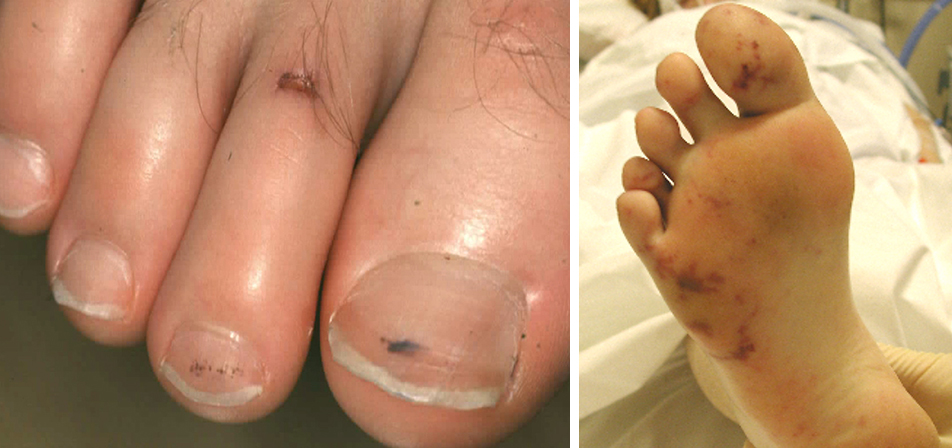 Splinterblødning (fig 2): Mindre blødning under neglen, ofte en rett linje. Kan ses ved ulike tilstander og være tegn på mikroembolisering