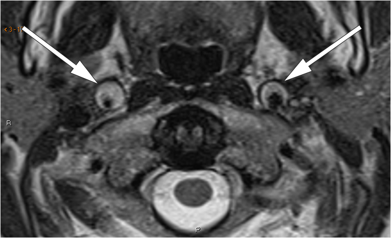 Nevrologisk undersøkelse avdekket Horners syndrom. CT-angiografi viste fortykket karvegg i begge a. carotis interna, mest uttalt på høyre side, fra like over bifurkaturen til skallebasis. MR-angiografi og T2-vektede bilder bekreftet bilateral carotisdisseksjon, med minste lumendiameter 2 mm på høyre side (bildet til venstre og bildet i midten). Fettsupprimerte T1-vektede bilder (bildet til høyre) viste høyt signal i arterieveggene, forenlig med intramurale hematomer.