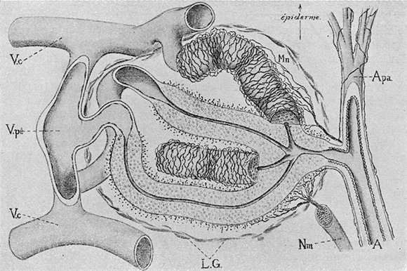 Hudens glomi og deres svulster er fremfor alt studert av Masson og Popoff. De er ikke medfødte, men opstår først ca. en måned efter fødselen. De formodes å ha betydning for blodcirkulasjonen ved blodtrykks- og varmeregulering. Mangelen på glomi ved fødselen og deres sklerosering i høi alder kan muligens bidra til forklaringen av den vanskelige varmereguleringen hos nyfødte og eldre.