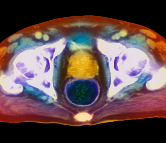 MR-undersøkelse av et aksialt (horisontalt) snitt gjennom en manns bekken viser kreft i prostatakjertelen (gult). Foto: Science Photo Library