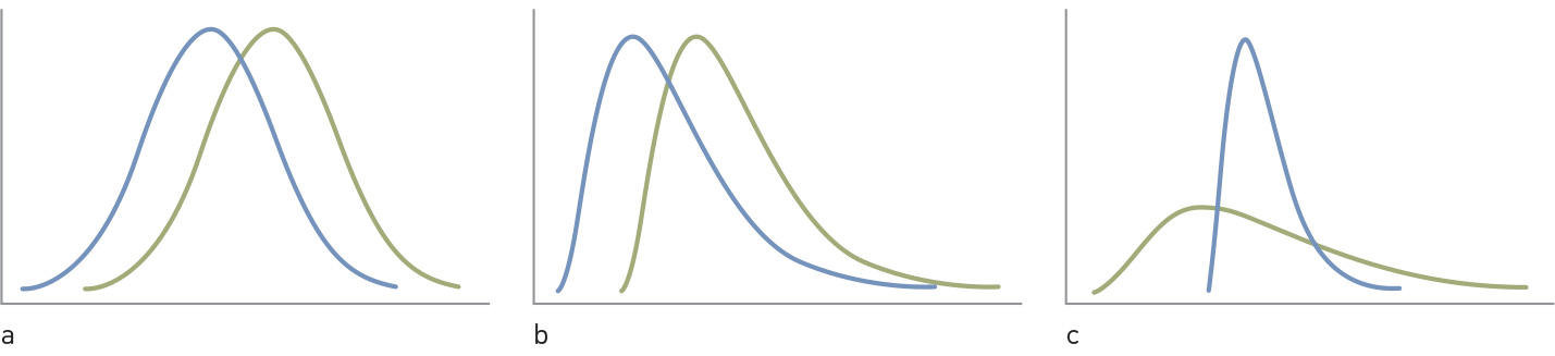 En minst like viktig begrunnelse er at når vi ønsker å sammenligne to utvalg, krever en ikke-parametrisk metode at de to fordelingene som skal sammenlignes, har samme spredning og form (fig 1a og b). Denne antagelsen gjelder også for en t-test når vi sammenligner gjennomsnittet i to uavhengige grupper, men t-testen er noe mindre sårbar for forskjellig spredning enn en ikke-parametrisk test, i alle fall når de to utvalgene er omtrent like store (1) . Den tradisjonelle t-testen tåler relativt godt avvik i størrelsesorden inntil to-tre ganger større standardavvik i den ene gruppen enn den andre. Mange statistikkpakker har for øvrig implementert en variant av t-testen (Welch test) som tar hensyn til at spredningen kan være ulik i de to gruppene. Vi kan altså relativt lett håndtere brudd på forutsetningen om lik spredning når vi benytter parametriske tester.