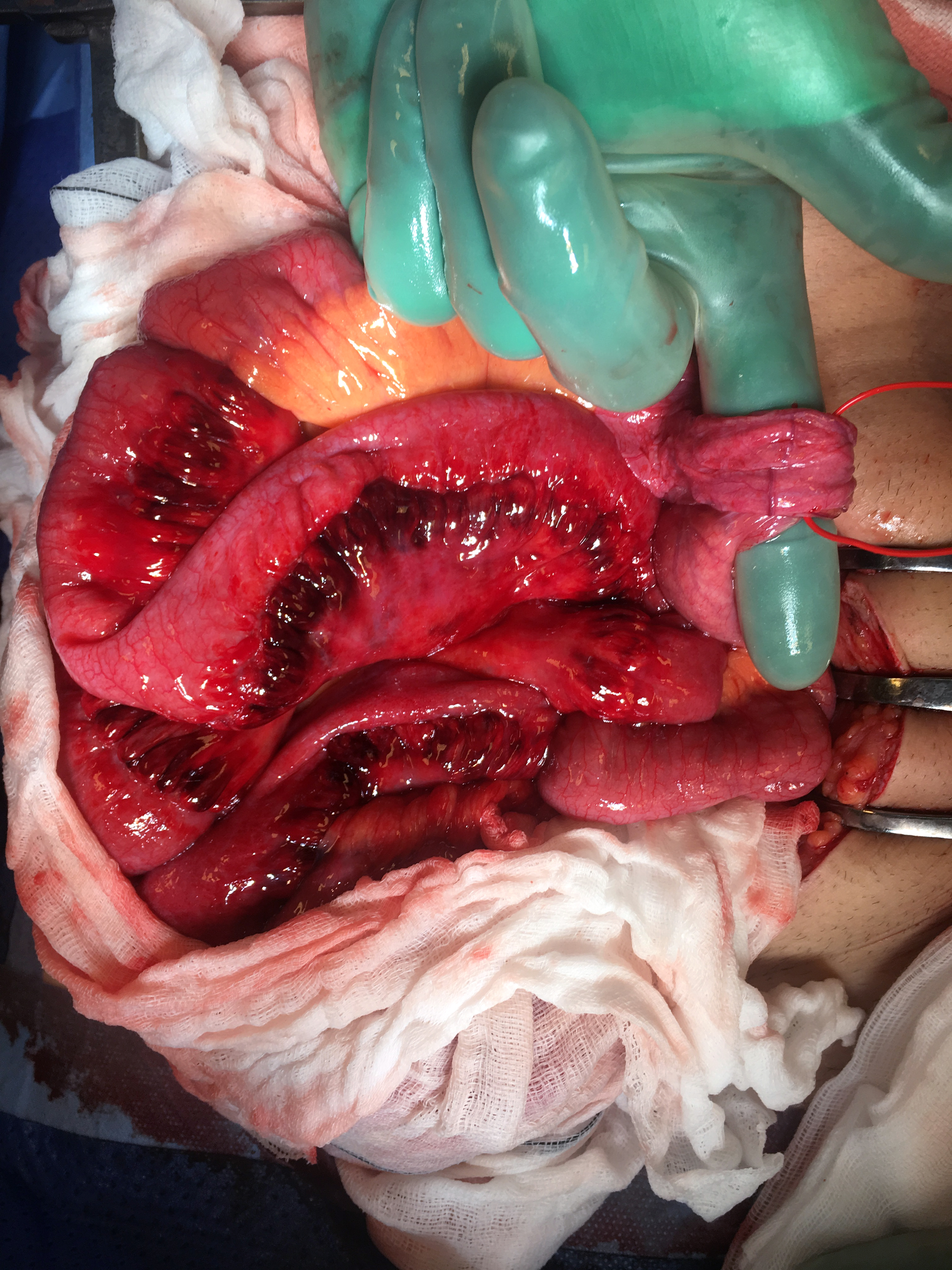 Han ble operert med laparoskopisk tilgang som ble konvertert til åpen tilgang, da tarmen ikke lot seg reponere laparoskopisk. Tynntarmen var herniert inn i en lomme i peritoneum ca. 15 cm distalt for Treitz’ ligament. Vel én meter tynntarm lå inn i en peritoneal brokksekk i et intramesenterisk brokk. Bildet viser brokksekken sammenfalt rundt fingeren og tynntarmen med ødem i mesenteriet. På bildet ses også lett misfarging av selve tarmen, forenlig med en delvis avklemming av sirkulasjonen. Brokkporten og sekken utgående fra peritoneum ble resesert. Pasienten ble utskrevet fjerde postoperative dag i god allmenntilstand.