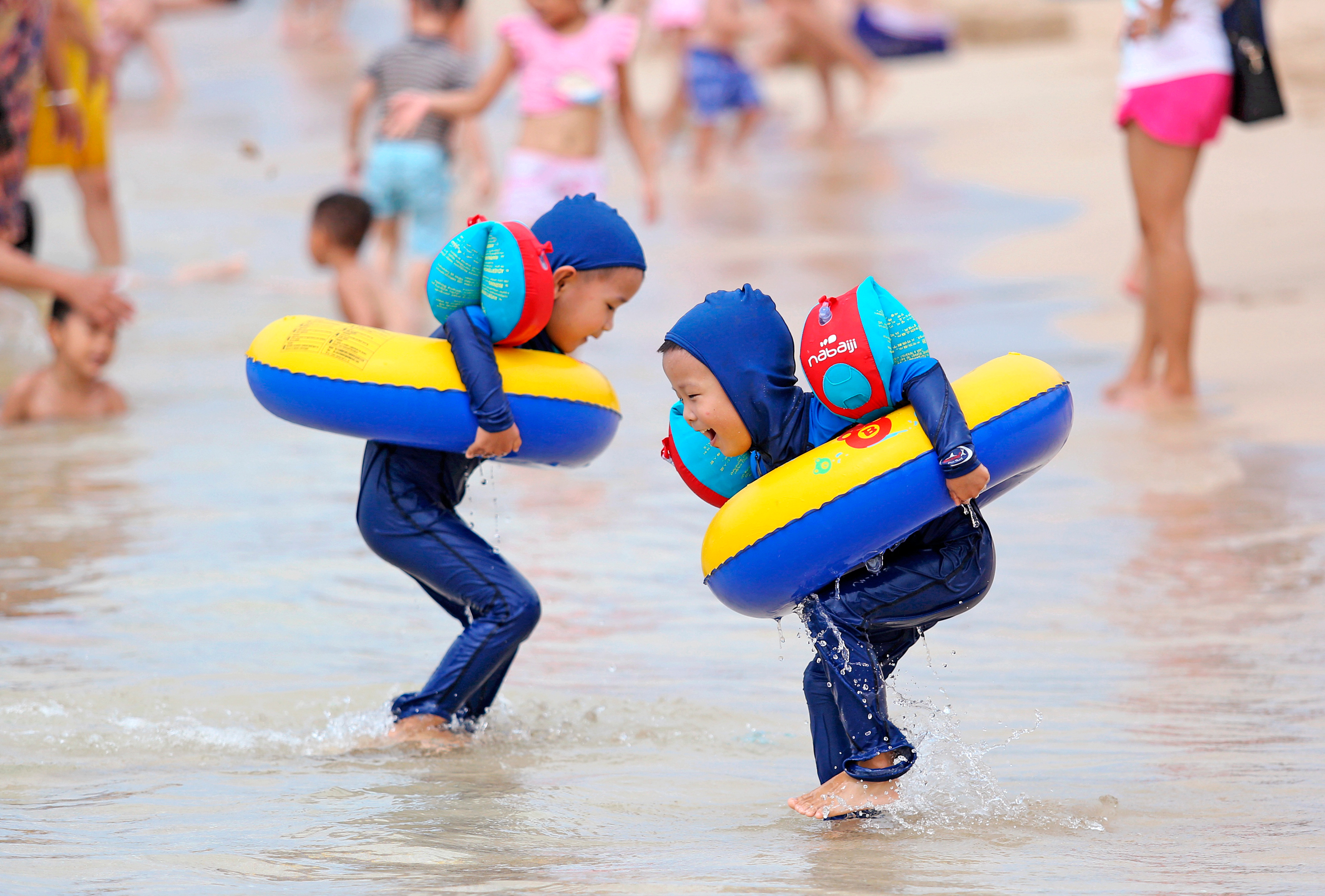 Barn leker på en strand i Sanya i Hainan-provinsen, Sør-Kina. Foto: Sipausa/NTB Scanpix