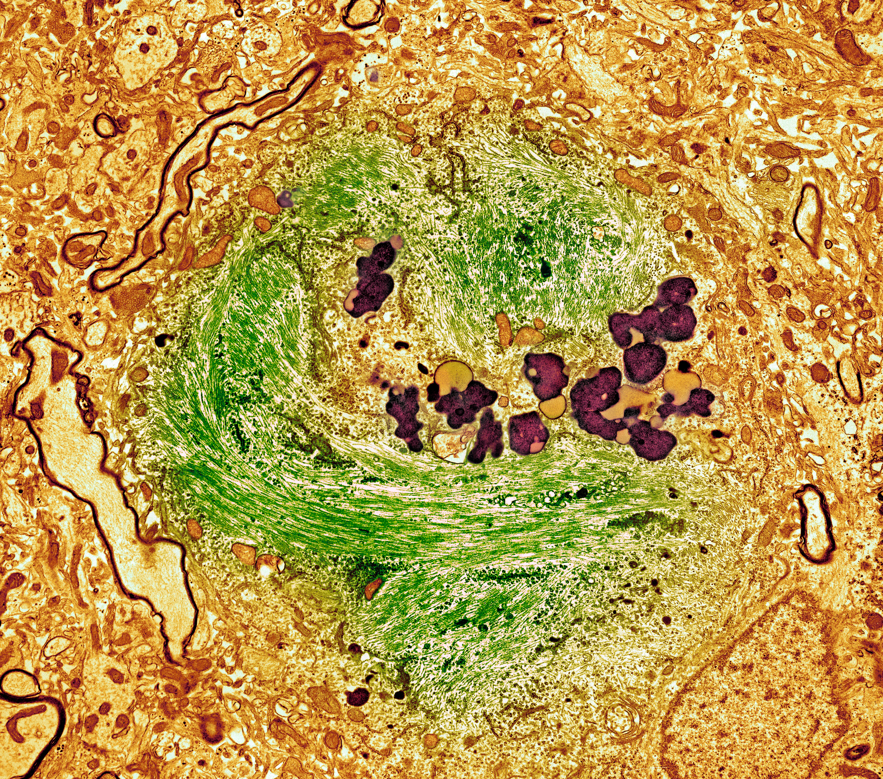 Farget transmisjonselektronmikroskopisk bilde av en nevofibrillær floke i en nervecelle fra hjernen til en pasient med Alzheimers sykdom. Illustrasjonsfoto: Science Photo Library