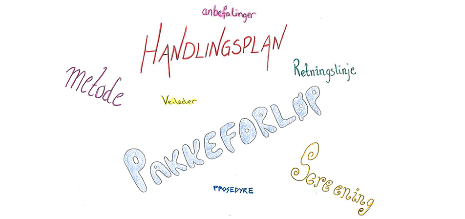 Betegnelsene på slike anbefalinger er neppe alltid like gjennomtenkte, og terminologien er dårlig standardisert. Ikke minst er helsemyndighetenes terminologi innen kreftomsorgen forvirrende. Her benyttes blant annet betegnelser som handlingsplan , handlingsprogrammer, pakkeforløp og screeningprogram (1) .