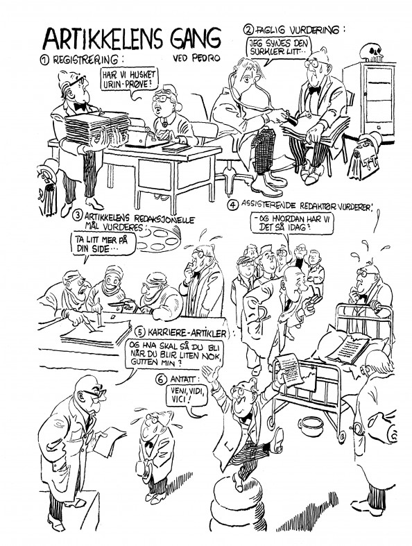 Tidligere i Tidsskriftet Artikkelens gang Julie Didriksen Om forfatteren Se alle artikler Julie Didriksen Orcid Tidsskriftet () sporsmal_grey_rgb Artikkel I 1981 fylte Tidsskriftet 100 år, og i årets første utgave sto følgende tegneserie på trykk (Tidsskr Nor Lægeforen 1981; 101: 52). Det er kanskje noen av forfatterne våre som føler det slik i dag også? Kommentarer ( 0 ) Dette kommentarfeltet modereres, men kommentarer blir ikke redaksjonelt behandlet ut over å sikre at de følger retningslinjer for vårt kommentarfelt. Denne artikkelen ble publisert for mer enn 12 måneder siden, og vi har derfor stengt for nye kommentarer. Publisert: 19. mars 2018 Utgave 6, 20. mars 2018 Tidsskr Nor Legeforen 19. mars 2018 Vol. 138. doi: 10.4045/tidsskr.18.0052 PlumX Publisert: 19. mars 2018 Utgave 6, 20. mars 2018 Tidsskr Nor Legeforen 2018 Vol. 138. doi: 10.4045/tidsskr.18.0052 Plum Print visual indicator of research metrics PlumX Metrics PDF Får du ikke vist PDF-filen eller vil lagre filen, kan du høyreklikke på PDF-ikonet. Velg «Lagre mål/fil som..» og hent så opp PDF-filen i for eksempel Acrobat Reader. Skriv ut Anbefalte artikler