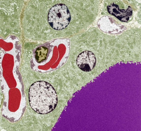 Follikkelcelle i thyreoidea. Lagring av tyroksin skjer i det lilla feltet, de grå og svarte strukturene er cellekjerner. Illustrasjonsfoto: Science Photo Library/NTB scanpix