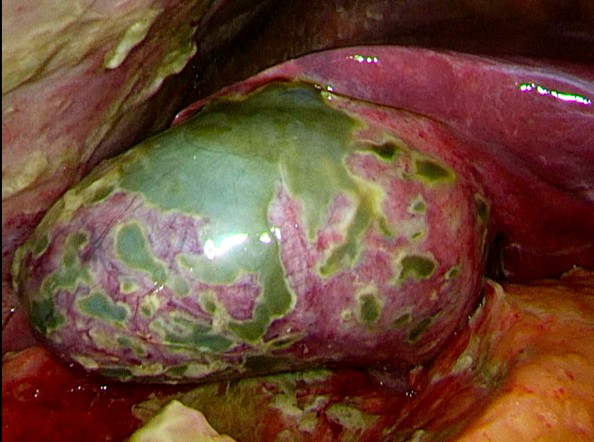 Bildet viser galleblæren slik den så ut ved laparoskopien. Den var svært inflammert og hadde konfluerende områder med nekrose. Galle hadde gjort det nekrotiske vevet grønnlig misfarget. Omkring galleblæren, både langs bukveggen og i tilliggende oment var det områder med fibrinavleiringer. Galleblæren ble operert ut. Inngrepet var ukomplisert, og pasienten ble skrevet ut andre postoperative dag. Histologisk undersøkelse av preparatet viste akutt ulceroflegmonøs betennelse med stedvis transmural nekrose.