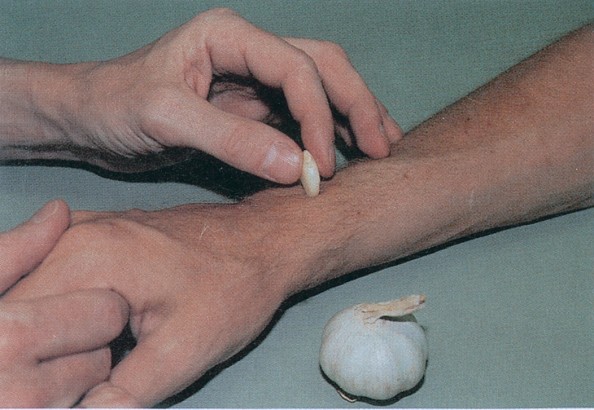 Figur 8 En av forfatterne gjorde tjeneste som åte. Den ene hånden ble grundig innsmurt med hvitløk, den andre var helt ren