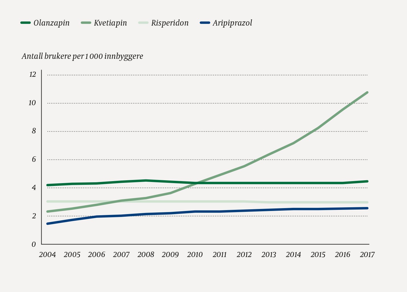 1. Gjerden P, Bramness JG, Tvete IF et al. The antipsychotic agent quetiapine is increasingly not used as such: dispensed prescriptions in Norway 2004-2015. Eur J Clin Pharmacol 2017; 73: 1173-9